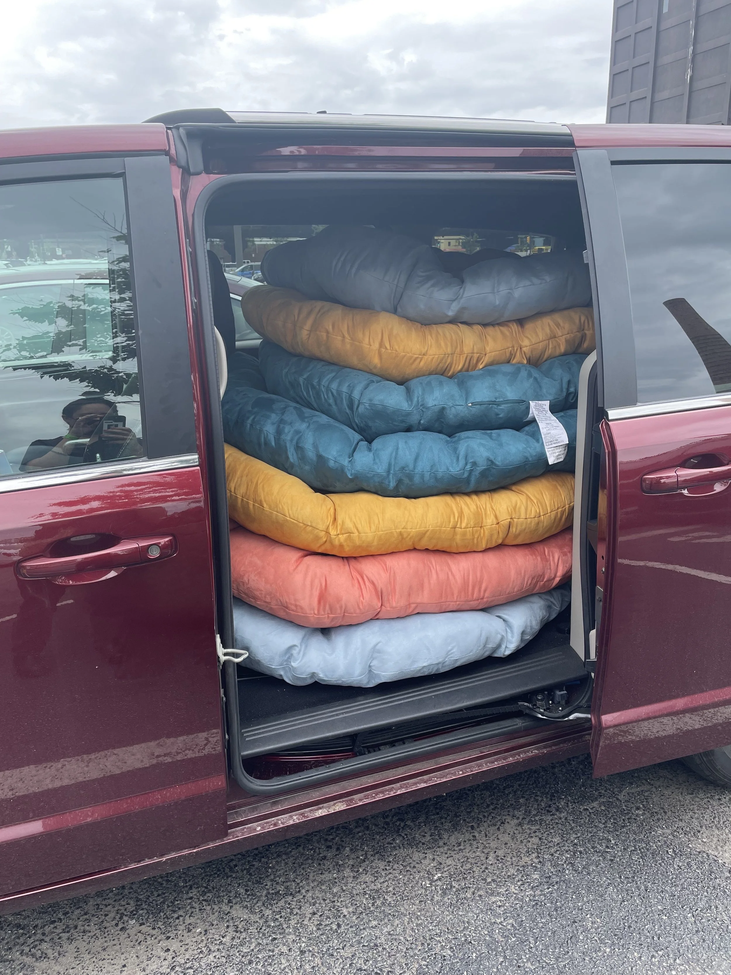 Katie our Assistant Decorator who found all these cushions in our perfect color palette sent me this hilarious photo of her loading up the cushions in our car after purchase for our set.